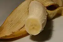 Le fruit du bananier est parfois considéré comme une baie, mais, au niveau botanique, il s'agit d'un faux-fruit qui dérive d'un ovaire infère. La partie externe du fruit, la peau de banane, correspond à la soudure du conceptacle et de l'épicarpe légèrement coriace de la fleur. La peau pèse initialement cinq fois plus que la pulpe, cette dernière se développant au cours du mûrissement[2].