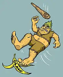 Le coup éculé de la glissade sur une peau de banane est un des plus vieux exemples de gag visuel du slapstick utilisé dans les comédies physiques (en), notamment celles du cinéma muet des années 1920[16]. Ce gag a pour origine les accidents provoqués par les peaux des bananes de Panama importées aux États-Unis dans la deuxième moitié du XIXe siècle et qui s'accumulaient dans les rues des villes américaines à une époque où les services de propreté n'étaient pas encore mis en service[17].