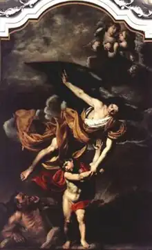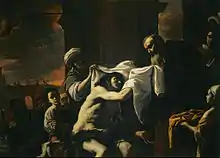 Mattia Preti (1613-1699), peintre calabrais formé à Rome dans le sillage de la peinture romaine du Caravage, arrive à Naples en 1653, introduisant la nouvelle manière de faire de la peinture baroque. Son arrivée marque un véritable moment de transition pour la peinture napolitaine, grâce au fait que son style réussit à réunir dans ses œuvres à la fois les modèles solaires du Corrège et les modèles atmosphériques de la peinture vénitienne du XVIe siècle, ainsi que les modèles naturalistes, ceux de la peinture caravagesque du début du XVIIe siècle[38]. Les peintures des portes de la ville sont celles sur lesquelles se retrouvent ces caractéristiques stylistiques et constituent les principales commandes du peintre une fois à Naples, pour lesquelles il doit exécuter des fresques avec des scènes votives pour la peste de 1656, dont il ne reste aujourd'hui que celles de la Porta San Gennaro et plusieurs esquisses préparatoires au musée de Capodimonte, les cycles de la coupole de l'église de San Domenico Soriano (perdus), pour lesquels il exécute également Saint Nicolas de Bari (vers 1653), Judith et Holopherne et Saint Jean-Baptiste (tous deux vers 1653-1656), Le Retour du fils prodigue (vers 1656), la Madone de Constantinople (1656), Saint Sébastien (vers 1657), le Banquet d'Absalom, Belshazzar (tous deux entre 1660 et 1665), tous conservés au musée de Capodimonte, puis une autre version du Retour du fils prodigue (1658) au Palais Royal de Naples, mais aussi la série de toiles exécutées pour le plafond de l'église de San Pietro a Majella avec les Épisodes de la vie de saint Pierre Célestin et de sainte Catherine d'Alexandrie, commencés en 1657 et terminés en 1673, avec les dernières œuvres envoyées alors qu'il est déjà à Malte, réalisant l'un des sommets de peinture italienne du XVIIe siècle[39],[40].