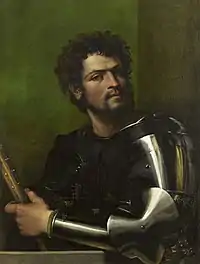 |  |  Sebastiano del Piombo (v. 1485–1547), vers 1515. Portrait d'homme en armure, 87 × 66 cm. Wadsworth Atheneum. |  |  Lorenzo Lotto (1480–1556), vers 1527. Portrait d'un jeune homme (Autoportrait[26]). 96 × 116 cm. Galerie dell'Accademia |