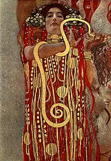En 1901, lorsque Gustav Klimt soumet La Médecine aux autorités académiques et au ministère autrichien, un scandale plus important encore voit le jour[3]. Une fois encore, la toile met en scène une humanité souffrante dans un enchevêtrement de corps nus qui traversent les différents âges de la vie à la mort représentée par un squelette. Deux personnages féminins attirent particulièrement l'attention. Il s'agit de celle qui figure au bas du tableau, habillée d'une longue tunique rouge : un serpent doré l'enlace et vient boire à sa coupe faisant d'elle une Hygie davantage prêtresse que guérisseuse[10],[11]. L'autre femme se trouve en haut, à gauche de l'œuvre. Elle est représentée nue dans une position d'abandon dynamique presqu'aquatique, les bras en croix évoquant une crucifixion. Ses poils pubiens attirent le regard, le scandale n'en est que plus grand. Une fois encore, le tableau représente l'Homme subissant les outrages du temps dans une vision pessimiste. La prêtresse semble davantage prête à sacrifier plutôt qu'à guérir[10]. Ici aussi, cette vision artistique de la Médecine ne plaira pas, ni aux instances académiques, ni à la presse dans cette Vienne fin de siècle qui entrait en friction avec le Modernisme viennois (Wiener Moderne) :