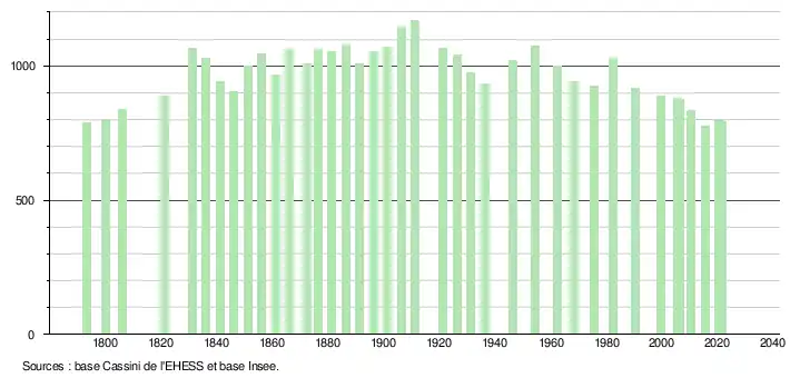 L'évolution du nombre d'habitants est connue à travers les recensements de la population effectués dans la commune depuis 1793. Pour les communes de moins de 10 000 habitants, une enquête de recensement portant sur toute la population est réalisée tous les cinq ans, les populations légales des années intermédiaires étant quant à elles estimées par interpolation ou extrapolation[35]. Pour la commune, le premier recensement exhaustif entrant dans le cadre du nouveau dispositif a été réalisé en 2005[36].