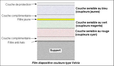Dans le cas général des diapositives de type Ektachrome (traitement E6), chacune des trois couches principales comporte des grains sensibles à la lumière qui forment une image négative. Celle-ci est inversée par voile chimique avant de faire agir les coupleurs qui formeront le colorant au cours du développement chromogène :