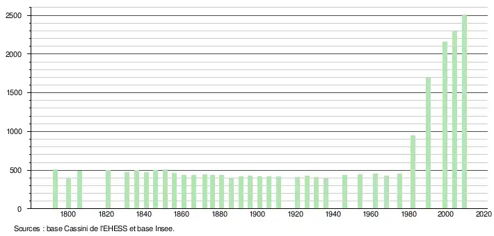 L'évolution du nombre d'habitants est connue à travers les recensements de la population effectués dans la commune depuis 1793. À partir du , les populations légales des communes sont publiées annuellement dans le cadre d'un recensement qui repose désormais sur une collecte d'information annuelle, concernant successivement tous les territoires communaux au cours d'une période de cinq ans. Pour les communes de moins de 10 000 habitants, une enquête de recensement portant sur toute la population est réalisée tous les cinq ans, les populations légales des années intermédiaires étant quant à elles estimées par interpolation ou extrapolation[11]. Pour la commune, le premier recensement exhaustif entrant dans le cadre du nouveau dispositif a été réalisé en 2004[12],[Note 1].