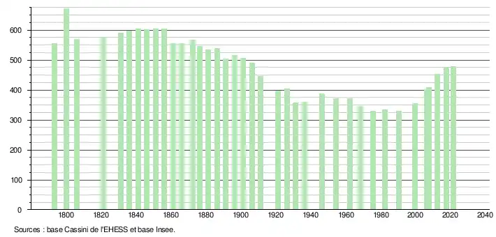 L'évolution du nombre d'habitants est connue à travers les recensements de la population effectués dans la commune depuis 1793. Pour les communes de moins de 10 000 habitants, une enquête de recensement portant sur toute la population est réalisée tous les cinq ans, les populations légales des années intermédiaires étant quant à elles estimées par interpolation ou extrapolation[25]. Pour la commune, le premier recensement exhaustif entrant dans le cadre du nouveau dispositif a été réalisé en 2007[26].