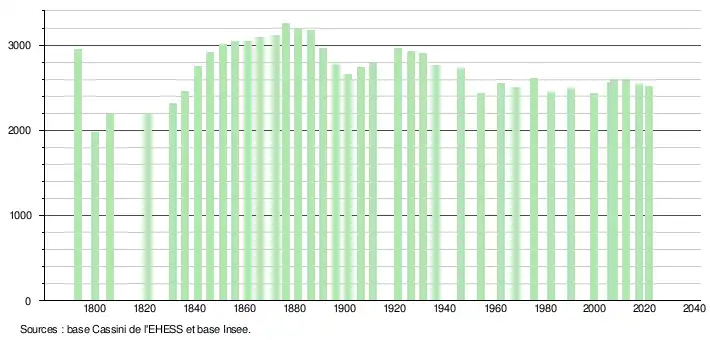 L'évolution du nombre d'habitants est connue à travers les recensements de la population effectués dans la commune depuis 1793. Pour les communes de moins de 10 000 habitants, une enquête de recensement portant sur toute la population est réalisée tous les cinq ans, les populations légales des années intermédiaires étant quant à elles estimées par interpolation ou extrapolation[37]. Pour la commune, le premier recensement exhaustif entrant dans le cadre du nouveau dispositif a été réalisé en 2007[38].