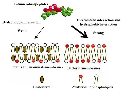 En revanche, la partie externe des membranes des plantes et des mammifères est principalement composée de lipides sans charge nette, car la plupart des lipides avec des groupes de tête chargés négativement sont principalement séquestrés dans la foliole interne des membranes plasmiques[30]. Ainsi, dans le cas des cellules de mammifères, les surfaces extérieures des membranes sont généralement constituées de phosphatidylcholine et de sphingomyéline zwitterioniques, même si une petite partie des surfaces extérieures de la membrane contient des gangliosides chargés négativement. Par conséquent, l'interaction hydrophobe entre la face hydrophobe des peptides antimicrobiens amphipathiques et les phospholipides zwitterioniques à la surface des membranes cellulaires des mammifères joue un rôle majeur dans la formation de la liaison peptide-cellule[34]. Cependant, l'interaction hydrophobe est relativement faible comparée à l'interaction électrostatique, ainsi, les peptides antimicrobiens vont interagir préférentiellement avec les membranes bactériennes. [réf. nécessaire] L'interférométrie à double polarisation a été utilisée in vitro pour étudier et quantifier l'association avec le groupe de tête, l'insertion dans la bicouche, la formation de pores et la rupture éventuelle de la membrane[35],[36].