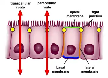 - La voie paracellulaire emprunte les minces espaces qui existent entre 2 cellules épithéliales adjacentes. Elle est finement régulée par des jonctions cellulaires localisées dans les membranes latérales[7]. C’est la principale voie d’écoulement passif de l’eau et des solutés dans l’épithélium intestinal. La régulation de cette voie dépend de plusieurs types de complexes, dont les jonctions serrées intercellulaires qui sont celles qui ont le plus d'influence sur le transport paracellulaire[9].