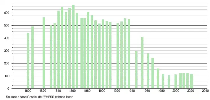 L'évolution du nombre d'habitants est connue à travers les recensements de la population effectués dans la commune depuis 1800. Pour les communes de moins de 10 000 habitants, une enquête de recensement portant sur toute la population est réalisée tous les cinq ans, les populations légales des années intermédiaires étant quant à elles estimées par interpolation ou extrapolation[7]. Pour la commune, le premier recensement exhaustif entrant dans le cadre du nouveau dispositif a été réalisé en 2005[8].