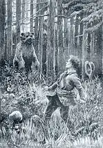 Justement, son espièglerie l'entraîne parfois sur des chemins dangereux, comme le jour où il s'aventure sur l'autre rive d'un cours d'eau. Sandre, furetant, découvre un caillou qui brille au soleil et qu'il prend sur le champ pour une pépite. L'ayant ramassé et enfoui dans sa poche, il se prépare à regagner la Belle Roulotte, lorsqu'un ours gigantesque se dresse devant lui et se met en devoir de le poursuivre. Sandre, acculé vers la berge de la rivière, réussit à se sortir de cette situation périlleuse grâce à son agilité. Il décide de cacher son « trésor » dans la roulotte et de l'offrir plus tard à ses parents, le moment venu. À l'arrivée en Russie, c'est en fait au comte Narkine qu'il montre sa trouvaille. Après l'avoir examiné, ce dernier décide de l'acheter vingt mille roubles et d'en gratifier les Cascabel. Mais on ne saura jamais si c'était une pépite ou un simple caillou.