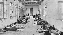 Pestiférés couchés dans un atelier de verrerie utilisé comme hôpital de fortune, Hong Kong, 1894.