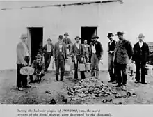 Militaires britanniques affectés au nettoyage d'un quartier pestiféré, posant derrière un cercueil (Hong Kong, 1894).