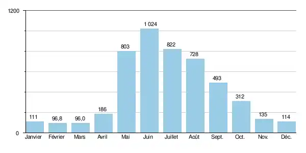 En considérant la seule période estivale, libre de glaces (de mai à septembre inclus), le débit mensuel minimal observé a été de 314 m3/s en , ce qui restait très confortable.