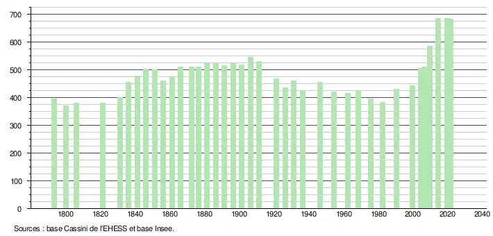 L'évolution du nombre d'habitants est connue à travers les recensements de la population effectués dans la commune depuis 1793. Pour les communes de moins de 10 000 habitants, une enquête de recensement portant sur toute la population est réalisée tous les cinq ans, les populations légales des années intermédiaires étant quant à elles estimées par interpolation ou extrapolation[16]. Pour la commune, le premier recensement exhaustif entrant dans le cadre du nouveau dispositif a été réalisé en 2004[17].