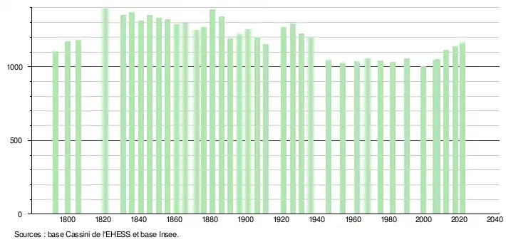 | L'évolution du nombre d'habitants est connue à travers les recensements de la population effectués dans la commune depuis 1793. Pour les communes de moins de 10 000 habitants, une enquête de recensement portant sur toute la population est réalisée tous les cinq ans, les populations légales des années intermédiaires étant quant à elles estimées par interpolation ou extrapolation[26]. Pour la commune, le premier recensement exhaustif entrant dans le cadre du nouveau dispositif a été réalisé en 2007[27]. En 2021, la commune comptait 1 160 habitants[Note 4], en augmentation de 4,6 % par rapport à 2015 (Aude : +2,47 %, France hors Mayotte : +1,84 %). |