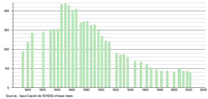 L'évolution du nombre d'habitants est connue à travers les recensements de la population effectués dans la commune depuis 1793. Pour les communes de moins de 10 000 habitants, une enquête de recensement portant sur toute la population est réalisée tous les cinq ans, les populations légales des années intermédiaires étant quant à elles estimées par interpolation ou extrapolation[30]. Pour la commune, le premier recensement exhaustif entrant dans le cadre du nouveau dispositif a été réalisé en 2007[31].