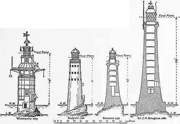 Le phare actuel est le quatrième à être implanté sur le site. Le premier et le deuxième ont été détruits. Le troisième, également connu sous le nom de « tour de Smeaton », est le plus connu en raison de son influence sur l'architecture des phares et de son importance dans le développement du béton dans le domaine de la construction.