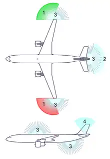 Les feux de navigation ou feux de position sont des lumières rouges (à gauche), vertes (à droite) et blanches (en queue) permettant aux pilotes d'apprécier leurs trajectoires relatives. Ils sont généralement situés aux extrémités des ailes et à la queue de l'avion. Ils sont facultatifs en vol de jour mais obligatoires de nuit[1].