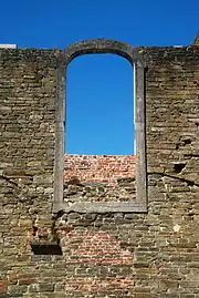L'espace compris entre les deux arcades est bordé au nord d'un mur en moellons de schiste présentant des traces d'arcs de décharge et d'impostes ainsi qu'une haute fenêtre dont il ne reste que l'encadrement en pierre bleue terminé par un arc en anse de panier.