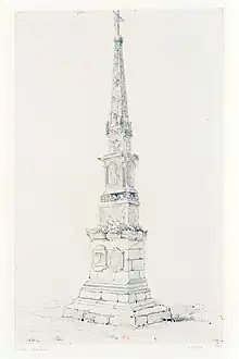 Le monument catholique érigé[5], qui « estoit une haute pyramide de pierre, ayant un crucifix au sommet, dorée et diaprée, avec un récit en lettres d'or, sur le milieu, de ce que dessus, et des vers latins, le tout si confusément et obliquement déduit que plusieurs estimoyent que le composeur de ces vers et inscriptions (on dit que c'estoit Estienne Jodelle, poète français homme, sans religion, et qui n'eut onc autre dieu que le ventre), s'estoit mocqué des catholiques et des huguenots », fut transféré, en , par pièces aux cimetière des Innocents[4].