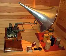 Parallèlement, l'ingénieur américain Thomas Edison, au cours de ses recherches sur le télégraphe, entend les petits bruits d'une pointe de répétiteur parcourant une feuille de papier, qui lui donnent l’idée de la technique à employer pour enregistrer puis diffuser le son. Par ailleurs, le téléphone a déjà permis la mise au point du diaphragme capable de restituer le son de la voix et le tube acoustique celle du conduit qui guide le son. Edison dépose le brevet du phonographe le , après un essai public le [11]. Il commercialise cette machine qui utilise des cylindres phonographiques, d'étain, puis de cire. La rotation est assurée en continu par une manivelle et régulée par un lourd volant. L'appareil d'Edison est un succès commercial à l'origine de l'industrie du disque. Edison étudie la motorisation électrique de la machine dès les années 1890.