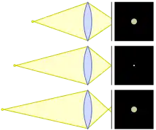 La lumière émise par l'objet photographié sera focalisée quelque part par l'objectif, c'est-à-dire que toute la lumière émise par un point donné de l'objet se rassemblera sur un même point de l'image, son point conjugué, dont la distance à l'objectif est donnée par la relation de conjugaison. C'est donc à cette distance de focalisation que la surface sensible doit être placée : si elle est située plus près ou plus loin, les rayons lumineux issu du même point de l'objet ne seront plus focalisés, et seront enregistrés sous la forme d'une tache, d'autant plus large que l'on s'éloigne du point focal.