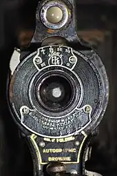 Fondamentaux de la prise de vue : lentille objectif, obturateur (réglé à 1/25), diaphragme (sur 3). On devine la forme hexagonale du diaphragme à travers l'objectif.
