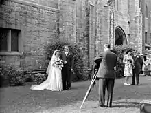 Un photographe spécialisé dans la photo de mariage s'apprête à saisir un couple de nouveaux mariés devant une église de Westmount, à Montréal, en 1945.