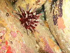 C'est un petit oursin régulier au test (coquille) sphérique généralement rouge, autour duquel rayonnent des piquants (« radioles ») clairsemés, cylindriques et très épais (il fait partie de la catégorie des « oursins-crayons » ou « oursins baguettes »). Ceux-ci sont généralement recouverts d'algues (épibiontes) qui les font paraître gris, alors que les plus jeunes (au sommet) sont souvent rougeâtres ; leur longueur dépasse rarement le diamètre du test (7 cm max pour le test). Les radioles secondaires, plus courtes, sont généralement de la même couleur que le test, et font office d'écailles recouvrant le test et les mamelons des radioles primaires. Les ambulacres sont distinctement sinueux.
