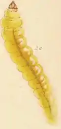 La chenille a une tête brun pâle, jaune foncé, une couleur très inhabituelle pour une larve de Gracillariidae. Les jeunes larves présentent une série de taches noires[2].