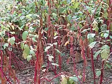 Cette plante est grande (jusqu'à 2 m), vigoureuse et à croissance rapide. Les feuilles sont simples et assez grandes, d'un vert moyen et lisse, avec une odeur jugée désagréable par certains. Portées par de longs pétioles elles sont disposées alternativement le long des tiges[3]. Les tiges sont robustes, lisses, vertes à rosâtres, rouges ou violacées et à moelle chambrée[3]. La racine claire et à pulpe blanche, elle est grosse et pivotante au centre, avec un développement en nappe pour les autres racines. La couronne de la racine produit de une à plusieurs tiges[3]. Des tranches de racines coupées transversalement montrent des anneaux concentriques. La racine n'a pas de capacité de fixation symbiotique de l'azote de l'air.