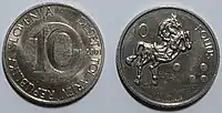 | 10 stotins | 16,0 mm | 0,655 g | 98 % Al 2 % Mg | un proteus avec la mention PROTEUS ANGUINUS et la valeur faciale 10 | La valeur faciale 10 dans un carré avec les mentions REPUBLIKA SLOVENIJA et DESET DESET STOTINOV | Miljenko Licul, Zvone Kosovelj et Janez Boljka | 1993-2006 | |