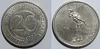 20 tolars | 24,0 mm | 6,85 g | une cigogne avec la mention CICONIA CICONIA et la valeur faciale 20 | La valeur faciale 20 dans un cercle avec les mentions REPUBLIKA SLOVENIJA et DVAJSET TOLARJEV et le millésime | 2003-2006 | ||