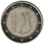 Un ensemble de points dont certains plus écartés forment, à droite, le contour de la Finlande. À gauche, verticalement, la mention du pays en finnois SUOMI suivi de l'année d'indépendance 1917. Sur une deuxième ligne, la mention du pays en suédois FINLAND suivi du millésime 2017. L'anneau externe de la pièce comporte les douze étoiles du drapeau européen. | ||||||