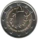 Tous les pays de la zone euro ont émis le 1er janvier une pièce commémorative de 2 € pour célébrer le 10e anniversaire de l'Union économique et monétaire. Le centre de la pièce illustre une silhouette humaine stylisée dont le bras gauche est prolongé par le symbole de l'euro. Le nom du pays émetteur SLOVENIJA apparaît dans la partie supérieure, tandis que l'indication 1999-2009 et l'acronyme EMU (pour Ekonomska in monetarna unija, Union économique et monétaire ou UEM) apparaissent dans la partie inférieure. L'anneau externe de la pièce représente les douze étoiles du drapeau européen. | ||||||