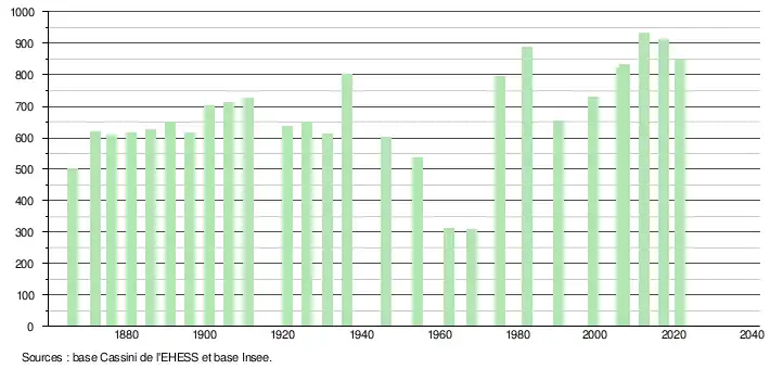 L'évolution du nombre d'habitants est connue à travers les recensements de la population effectués dans la commune depuis 1866. Pour les communes de moins de 10 000 habitants, une enquête de recensement portant sur toute la population est réalisée tous les cinq ans, les populations légales des années intermédiaires étant quant à elles estimées par interpolation ou extrapolation[11]. Pour la commune, le premier recensement exhaustif entrant dans le cadre du nouveau dispositif a été réalisé en 2007[12].