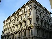 Le bâtiment d'angle à cinq axes est un exemple d'historicisme éclectique à Trieste : il combine des éléments de l'Antiquité classique et de la Renaissance italienne avec des styles médiévaux et baroques.