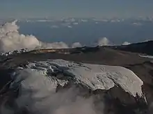 Vue aérienne du versant nord-ouest du Kibo avec les glaciers et la double caldeira sommitale en 2004.
