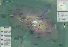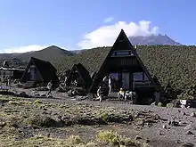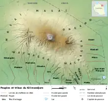 Le Kilimandjaro est formé de trois sommets principaux qui sont le Shira, le Mawenzi (en kichagga Kimawenze ou Mavenge signifiant « sommet fendu », cette apparence faisant l'objet d'une légende locale[4],[5]) et le Kibo (en kichagga Kipoo ou Kiboo signifiant « tacheté » en raison d'un rocher sombre qui dépasse des neiges éternelles[4], aussi appelé Kyamwi, « le lumineux »[5]). Ce dernier abrite le point culminant de l'ensemble, le pic Uhuru (terme swahili signifiant « liberté »). Il avait été baptisé Kaiser-Wilhelm-Spitze de 1889 à 1918 en l'honneur de Guillaume II d'Allemagne à la suite de la colonisation de l'Afrique orientale allemande par signature de traités entre Carl Peters et des chefs locaux, jusqu'au passage du Tanganyika sous administration britannique[6].