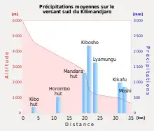 Les conditions climatiques varient en fonction des versants du Kilimandjaro. Ainsi, sur le versant méridional, il tomberait 850 millimètres de précipitations par an à Moshi à 800 mètres d'altitude, 992 millimètres à Kikafu à 960 mètres d'altitude, 1 663 millimètres à Lyamungu à 1 230 mètres d'altitude et 2 184 millimètres à Kibosho à 1 479 mètres d'altitude tandis que sur le versant oriental, il tomberait 1 484 millimètres à Mkuu à 1 433 mètres d'altitude ; ces données sont toutefois à prendre avec précaution en raison des différentes méthodes utilisées. Le pic altitudinal de précipitations se situerait entre 2 400 et 2 500 mètres d'altitude sur le versant méridional et n'est pas encore déterminé sur les autres versants. Au-delà, le modèle pluviométrique se complexifie avec l'apparition de précipitations par contact, qualifiées de « néphéléniques », au niveau des forêts puis une très nette diminution[21] avec 1 300 millimètres au refuge Mandara à 2 740 mètres d'altitude, 525 millimètres au refuge Horombo à 3 718 mètres d'altitude et moins de 200 millimètres par an au refuge Kibo au-dessus de 4 630 mètres d'altitude[40]. Les échanges par convection qui constituent le cycle de l'eau entre les différents étages de végétation du Kilimandjaro sont très importants sur le plan bioclimatique[21].
