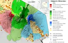 Le volcanisme du Kilimandjaro débute au cours du Pliocène ; la construction de son édifice se serait déroulée en quatre grandes phases, durant lesquelles ont été émis 5 000 km3 de roches volcaniques[25]. Les trois dernières ont formé les stratovolcans imbriqués qui constituent le Shira, le Kibo et le Mawenzi. Le rift orienté ouest-nord-ouest—est-sud-est qui les traverse a également donné naissance à de nombreux cônes satellites, répartis en approximativement huit zones. Quelques bouches éruptives situées au sommet semblent avoir été actives pendant l'Holocène[8].
