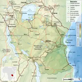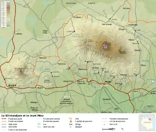 Cartes topographiques de la Tanzanie (à gauche) et du Kilimandjaro et du mont Méru (à droite).