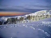La calotte locale du Kilimandjaro est confinée au Kibo. Elle couvrait en 2003 une surface cumulée de km2. Elle est constituée par le glacier Furtwängler sur la partie sommitale, des glaciers Drygalski, Great Penck, Little Penck, Pengalski, Lörtscher Notch et Credner au niveau du champ de glace Nord (en anglais Northern Icefield), des glaciers Barranco (ou Little et Big Breach), Arrow et Uhlig à l'ouest, des glaciers Balletto, Diamond, Heim, Kersten, Decken, Rebmann et Ratzel au niveau du champ de glace Sud (en anglais Southern Icefield) et enfin du champ de glace Est (en anglais Eastern Icefield). La variabilité géographique des précipitations et de l'ensoleillement explique la différence de taille entre les différents champs de glace[14].