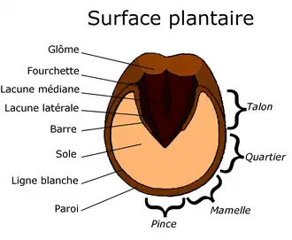 La partie du sabot qui repose sur le sol est nommée surface plantaire ou surface solaire. Elle est concave et ouverte vers l'arrière. Son pourtour est formé par la partie inférieure de la paroi, qui constitue la surface réellement portante du pied. La sole est la partie concave de la voûte plantaire, formée de corne sèche et parfois friable[25]. La zone située entre la sole et la paroi se nomme ligne blanche. La fourchette est une saillie en forme de V à pointe antérieure, composée d'une corne plus molle[25]. En effet, elle est constituée de corne tubulaire. Ces derniers[Quoi ?] sont organisés de façon anarchique, ce qui confère à la fourchette une remarquable élasticité[26]. Les creux de chaque côté du V de la fourchette sont nommés lacunes latérales, le sillon entre les branches du V, lacune médiane[27]. Les branches du V rejoignent en arrière le bourrelet périoplique pour former les glomes[24]. Les lacunes latérales sont délimitées à l’extérieur par les barres, repli de corne dure de même composition que la paroi.