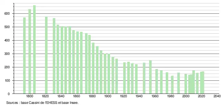 L'évolution du nombre d'habitants est connue à travers les recensements de la population effectués dans la commune depuis 1793. Pour les communes de moins de 10 000 habitants, une enquête de recensement portant sur toute la population est réalisée tous les cinq ans, les populations légales des années intermédiaires étant quant à elles estimées par interpolation ou extrapolation[25]. Pour la commune, le premier recensement exhaustif entrant dans le cadre du nouveau dispositif a été réalisé en 2004[26].