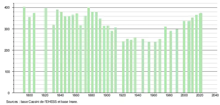 L'évolution du nombre d'habitants est connue à travers les recensements de la population effectués dans la commune depuis 1793. Pour les communes de moins de 10 000 habitants, une enquête de recensement portant sur toute la population est réalisée tous les cinq ans, les populations légales des années intermédiaires étant quant à elles estimées par interpolation ou extrapolation[18]. Pour la commune, le premier recensement exhaustif entrant dans le cadre du nouveau dispositif a été réalisé en 2005[19].