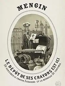 Mengin commence à être connu en tant que fabricant et marchand de crayons dès le début des années 1850[8]. Ses articles sont déposés dans plusieurs commerces, principalement des débits de tabac, mais il les vend également lui-même sur les places de Paris et de province, et même quelquefois à l'étranger. On le rencontre le plus souvent sur la place de la Bourse ou celle de la Madeleine[9]. En 1853, dans un article du Journal pour rire illustré par Bertall et consacré aux « saltimbanques » et « charlatans » des rues de Paris, Albert Monnier décrit la méthode de vente ambulante de Mengin[10]. Par la suite, d'autres auteurs, comme Victor Fournel, Charles Yriarte et Alfred Delvau, apporteront des détails sur la routine, le déguisement et les boniments du marchand[11].