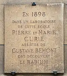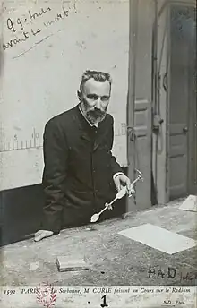 Après la découverte de la radioactivité naturelle par Henri Becquerel, Pierre et Marie Curie étudient les propriétés de rayonnement des corps radioactifs comme l'uranium et parviennent à séparer deux métaux très radioactifs, le polonium[19] puis le radium en collaboration avec Gustave Bémont. Avec André-Louis Debierne puis Jacques Danne, il découvre la radioactivité induite[20] et mesure la charge électrique du rayonnement émis par les corps radioactifs[21].