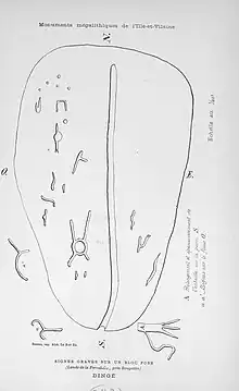 C'est une pierre ovoïde en granite[1] longue de 3,30 m et large au maximum de 2 m. Elle est posée à plat sur le sol dont elle dépasse au maximum de 1,50 m. Elle comporte une entaille de 10 cm de profondeur sur 6 cm de largeur qui la divise en deux parties à peu près égales. La pierre est recouverte de diverses gravures de 1 à 2 cm de profondeur sur la face supérieure et les flancs dont P. Bézier a publié un relevé en 1883[2].
