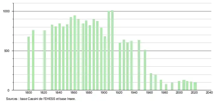 L'évolution du nombre d'habitants est connue à travers les recensements de la population effectués dans la commune depuis 1800. Pour les communes de moins de 10 000 habitants, une enquête de recensement portant sur toute la population est réalisée tous les cinq ans, les populations légales des années intermédiaires étant quant à elles estimées par interpolation ou extrapolation[13]. Pour la commune, le premier recensement exhaustif entrant dans le cadre du nouveau dispositif a été réalisé en 2005[14].